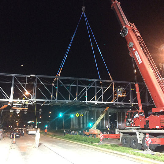 This project consisted of constructing a 154? steel truss pedestrian bridge over Hwy 69 in Des Moines, Iowa. The unique features of this project include a value engineering proposal to change the steel beam design of the bridge to a pre-fab tube steel bridge. Doing this saved the university a considerable amount of money.