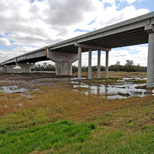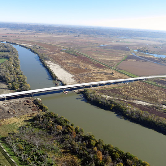 The new bridge carries relocated US 34 over the Missouri River north of Plattsmouth, Nebraska. The $61M bridge has 18 spans resulting in a total bridge length of 3,280 feet. The main span over the navigation channel is 515 feet in length, and the roadway width is 86 feet to accommodate two lanes of traffic in both the EB and WB directions. The bridge has four units, with the river span unit being comprised of 3 spans of haunched steel plate girders. The steel unit utilizes five main load carrying girders with a sub stringer system. The remaining three units for the Nebraska and Iowa approaches are comprised of 150 pre-stressed concrete girders. The steel unit is supported on 4 large hammerhead piers. The river piers are supported on 48 inch diameter pipe piles and the remaining substructure elements are supported on steel-H piles. HDR performed the design of the new bridge as well as conducted a corridor study and the Environmental Impact Statement for the new bridge. The geotechnical design services were provided by Kleinfelder, a member of HDR's Design Team, and the Jensen Team, for the US-69 Design Build project. Kleinfelder's services included geotechnical exploration and design recommendations for the bridge foundations utilizing H-piles and pipe piles